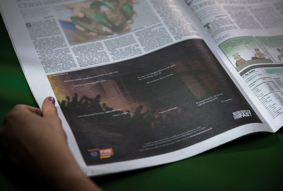 The idea: We filled the paper with ads that sent the reader on a immersive journey from section to section, mimicking the panic and disorientation of trying to escape a house fire. Desperation mounts in each of the four ads through storytelling and art direction, showing readers why it’s crucial to make an escape plan.