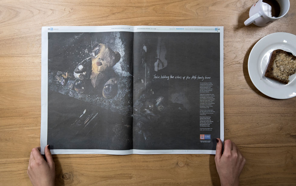 The idea: We mixed ash from local house fires into the ink of newspapers across NZ, to bring to life the dangers of not having a working smoke alarm in an emotional way.